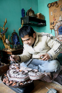 Pradip Shakya (Traditional Sculptor, 1977A.D.) born in traditional craft man family. He had started his craft career from his own home since 1993 after completion of his S.L.C. (School Living Certificate). His educational background is Bachelors in Business Studies and Diploma in Engineering from Tribhuwan University.
